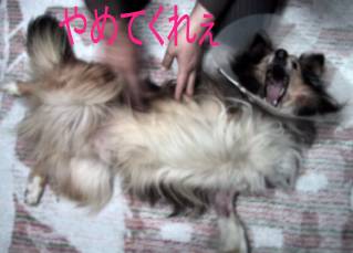 ..zzZZ 夜中にガサゴソ、ボリボリ、バリバリ、etc ん?何やってんの。よく見てみると首のあたりがかゆいらしい。そう言えば寝る前も後ろ足で掻いていたっけ。よっぽど痒いのかな。 ポリポリ、とっても優しい飼い主(←自分で言うなって(^^;)代わりに掻いてあげます。 こういうのを絵に描いたような「痒いところに手が届く」って事なんでしょうね。 ここ?エリザベスカラーのあたりがどうしてもそうなるのかも。 ひとしきり掻いてあげてさあ寝ようね。 その後、朝も早うからペロペロ。あーん、寝せてくれ