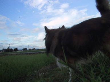 朝から少し、そして夕方にもお出かけのがんばるワンズです。 西の空には雲の合間に青空が見えています。 東の空は厚い雨雲がたれ込めています。 雨がぽつりぽつりと降ってきました。でもこの感じはお天気雨かな 旅は続行です。 風があって涼しくエルにもちょうどいいようです。