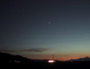 夕焼けがもう小さくなって、空には低くいっぱいの入道雲。 まだ青空が雲の上に広がっています。 ふと気がつくと西の空に一番星がきらり☆ きっとがんばるワンズの旅を見守ってるんだよね