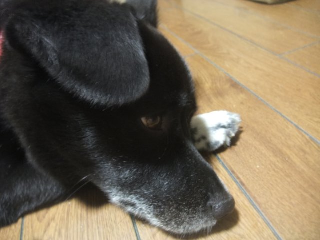 姫が横たわっている。朝刊を読む飼い主のそばでイヴ姫が横たわってエル。