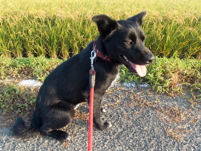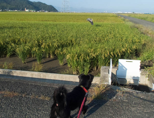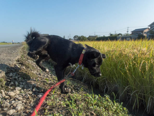 実るほど頭を垂れる稲穂とオスワリをするマリン