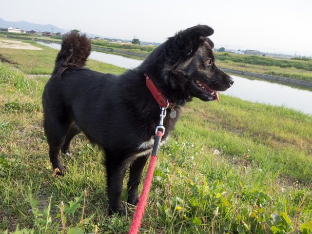 左岸の上流に来て、川向こうを眺めるマリン。