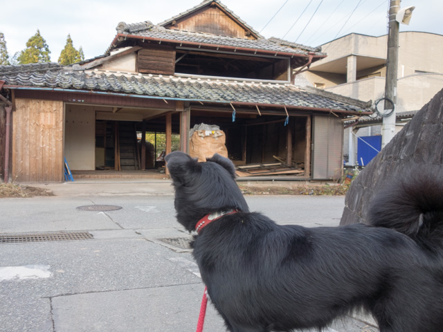 イチョウの葉っぱを時々フミフミ、神社帰りのマリンが行く。