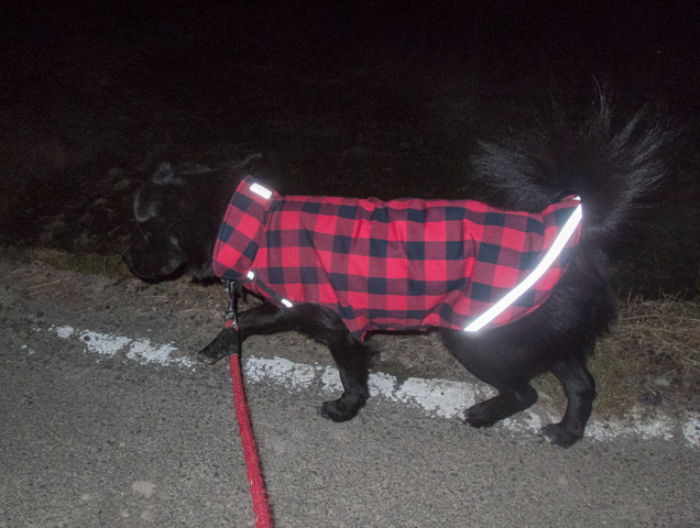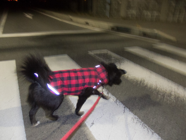 手を挙げて、横断歩道を渡るでしゅ♪蛍光の反射テープがびっかびかのマリン。うーん、かなり目立ってるワン。だけど、車が全然走ってないぞ。