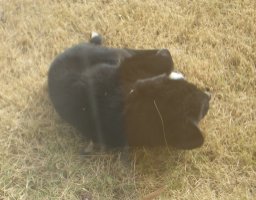 - ねえねえ、見て。何日か前からウチの庭に黒い子犬が居着いてるの。